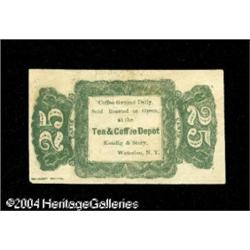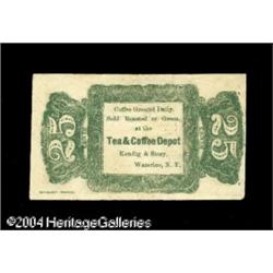 Waterloo, NY- Tea & Coffee Depot 25¢ Ad Note RA ver <B>Waterloo, NY- Tea & Coffee Depot</B></I> 25¢ Ad Note<BR>A very neat Fractional Currency lookalike which we've not seen previously. <B>About Uncirculated,</B></I> with one tiny split that affects nothing. <BR><BR><B>Important notice:</B> Heritage usually auctions material at the rate of 200-250 lots per hour. On some occasions eBay Live bid software or the Internet may not be able to keep up with the pace of the auction. We recommend placing a realistic absentee bid now as insurance to avoid disappointment. Occasionally the auctioneer may eliminate or reject an eBay Live bid, and the auctioneer may also reopen a lot after the close of the eBay live bidding (usually because we missed an audience bid), and may reject your bid even if it shows you as the winning bidder. By bidding via eBay Live, you agree that Heritage may award the lot to another bidder at its sole discretion under the circumstances described above or any other reasonable circumstances. Since eBay bids are not shown to us until we open the lot on the floor, we treat those bids just like floor bids. In most cases the floor responds before the eBay bid is presented to us, due to Internet lag time, so for consistency we have made it a policy that floor bids are always considered first over tie eBay live bids. Also please note that all Heritage lots purchased through eBay Live carry a 20% Buyer's Premium. Please make sure you read the Terms and Conditions before you bid. This lot is being auctioned in conjunction with a live floor auction by Heritage Galleries & Auctioneers. All final auction and invoice information will be supplied by Heritage Galleries & Auctioneers, and all other information should be considered preliminary. Lot:15846