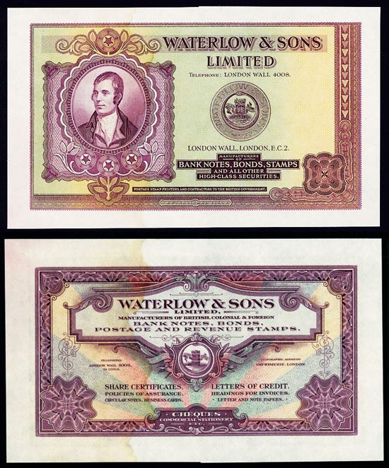 London. ND (1930's). No denomination. Face is purple and brown on m/c underprint with text describing their printing services including ÒBanknotes, Bonds and StampsÓ on white paper. Portrait of official looking gentleman on left with ornate frames and borders of note. Back is plum and m/c with text describing company's printing services. AU condition with evidence of water staining on the left 1/3rd of the note that is difficult to see. W&S. Scarce advertising note variety.