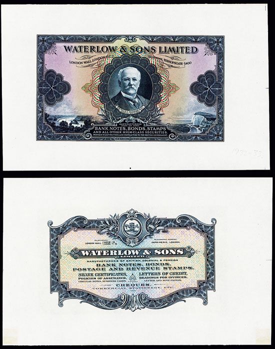 London. ND (ca.1932-1933). Face is dark blue on m/c underprint with text describing their printing services including ÒBanknotes, Bonds and StampsÓ on white paper with large margins. Portrait of Sir Philip H.Waterlow, Chairman, 1872-1923 in middle with ocean and river scenes on LL and LR. Back is blue and m/c with text describing company's printing services. XF+ to AU condition. W&S. Scarce advertising note variety.