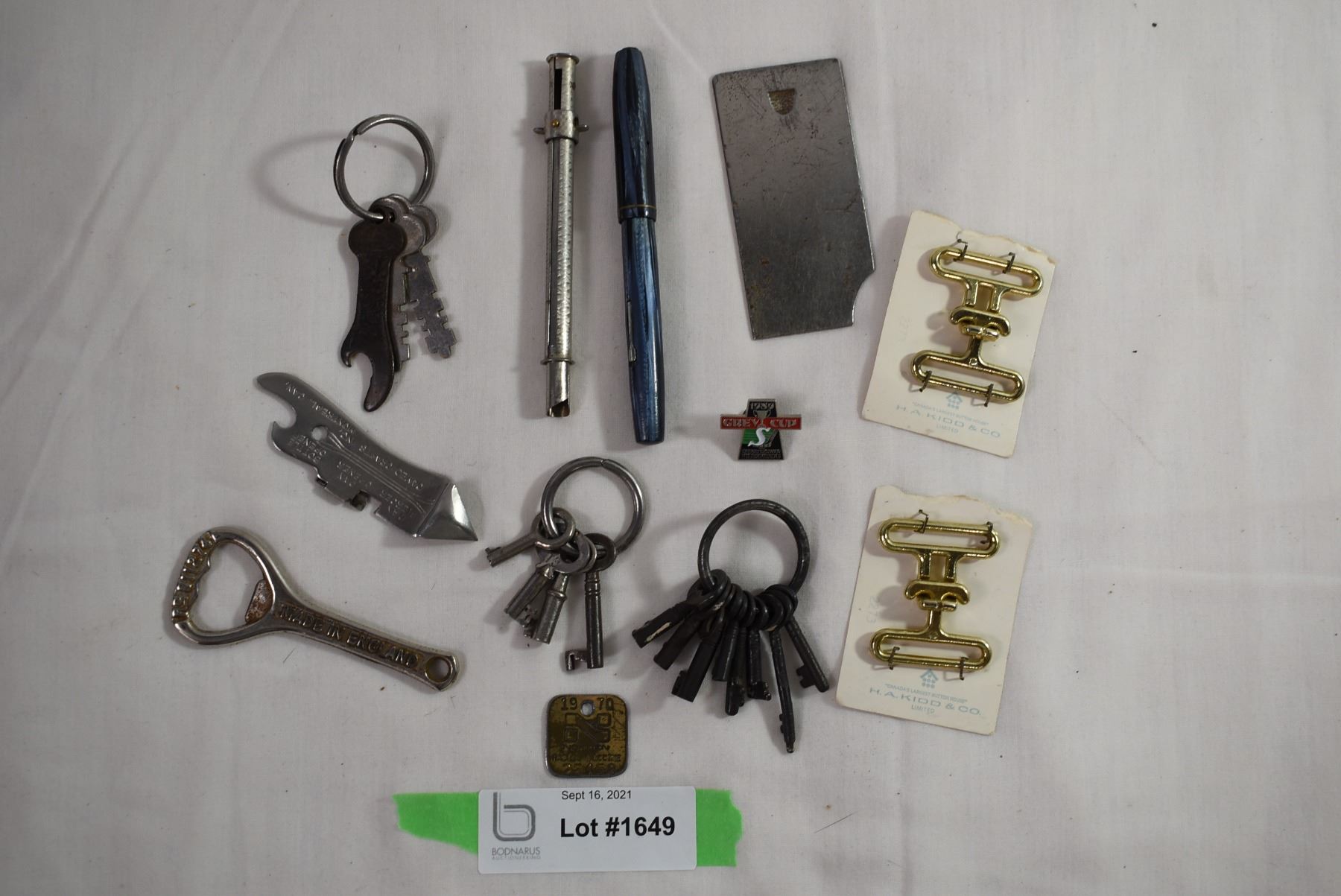 Watermans fountain pen, rabies vaccine passport, various vintage keys + bottle openers, misc