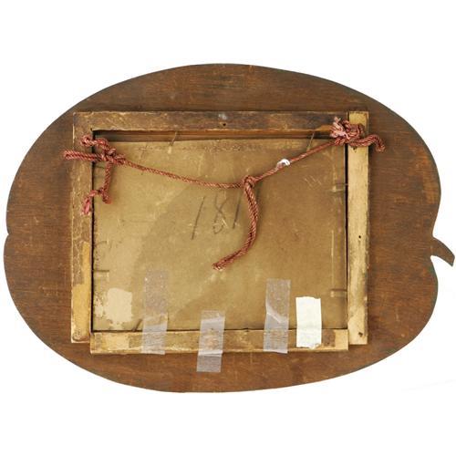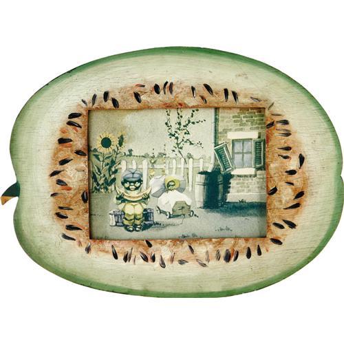 <B>Watermelon Frame With Black Scene.</B></I> Judging from the mountain of watermelon-related items created for the white consumer in bygone days, it would seem that African-Americans were not the ethnic group obsessed with the big fruits. This hand-painted wooden melon frame, though, carries a color print of a young black fellow chomping down on a watermelon. A small, chip to the frame's "stem", else fine condition. 14.5" x 10.5".