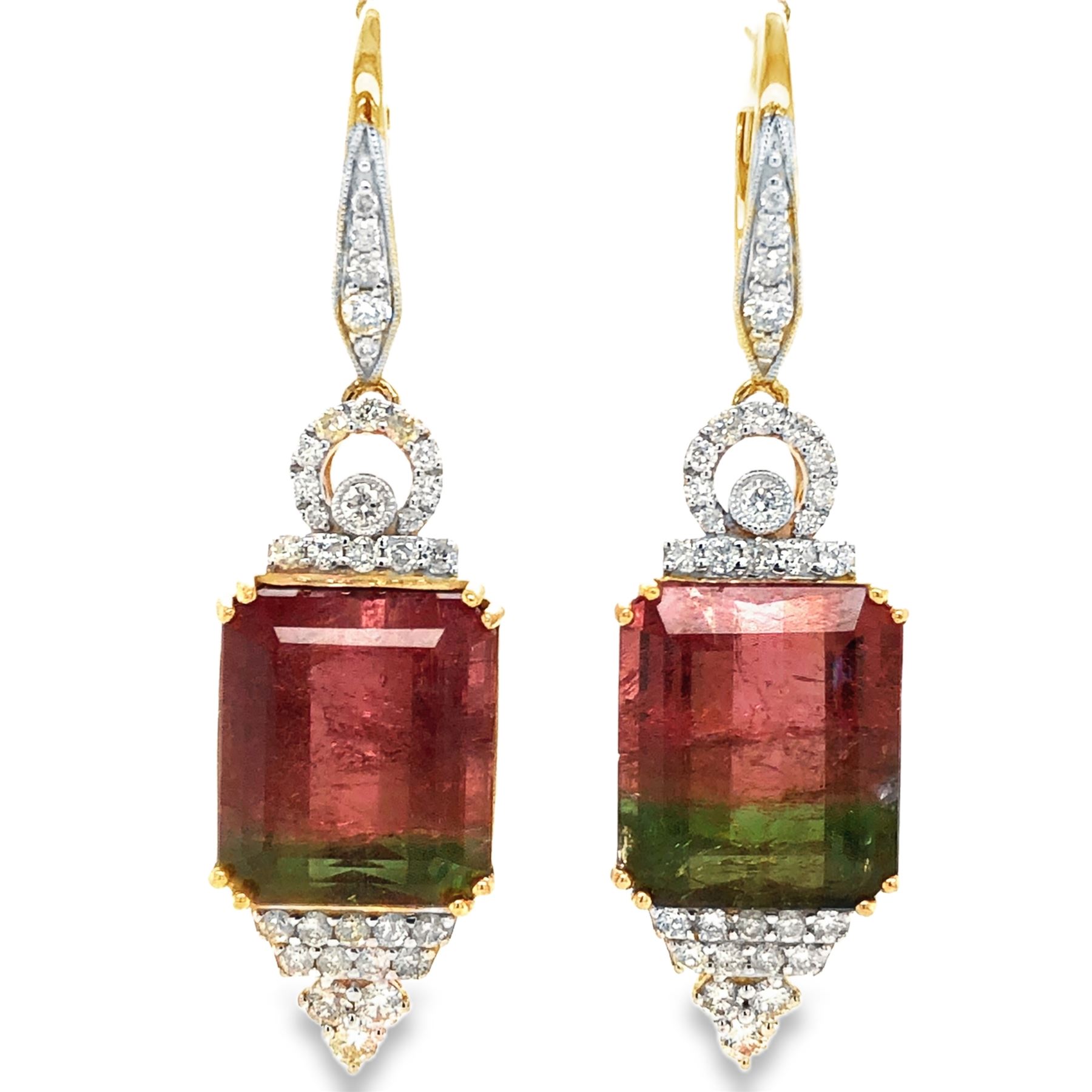 TITLE DESCRIPTION: 14K Two Tone Gold Watermelon Tourmaline Dangle Earrings