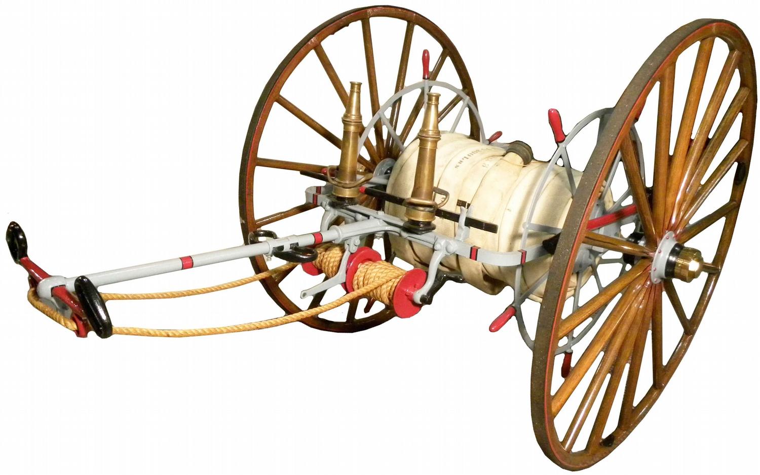 Waterous Engine W'ks. Co. Mfg.'s Fire Hose Cart. St. Paul, Minn. Steel grey with red trim. Brass Nozzles on the front. Professionally restored to original condition. 10'9" long including the tongue, 6'2" tall and 5'7" wide.