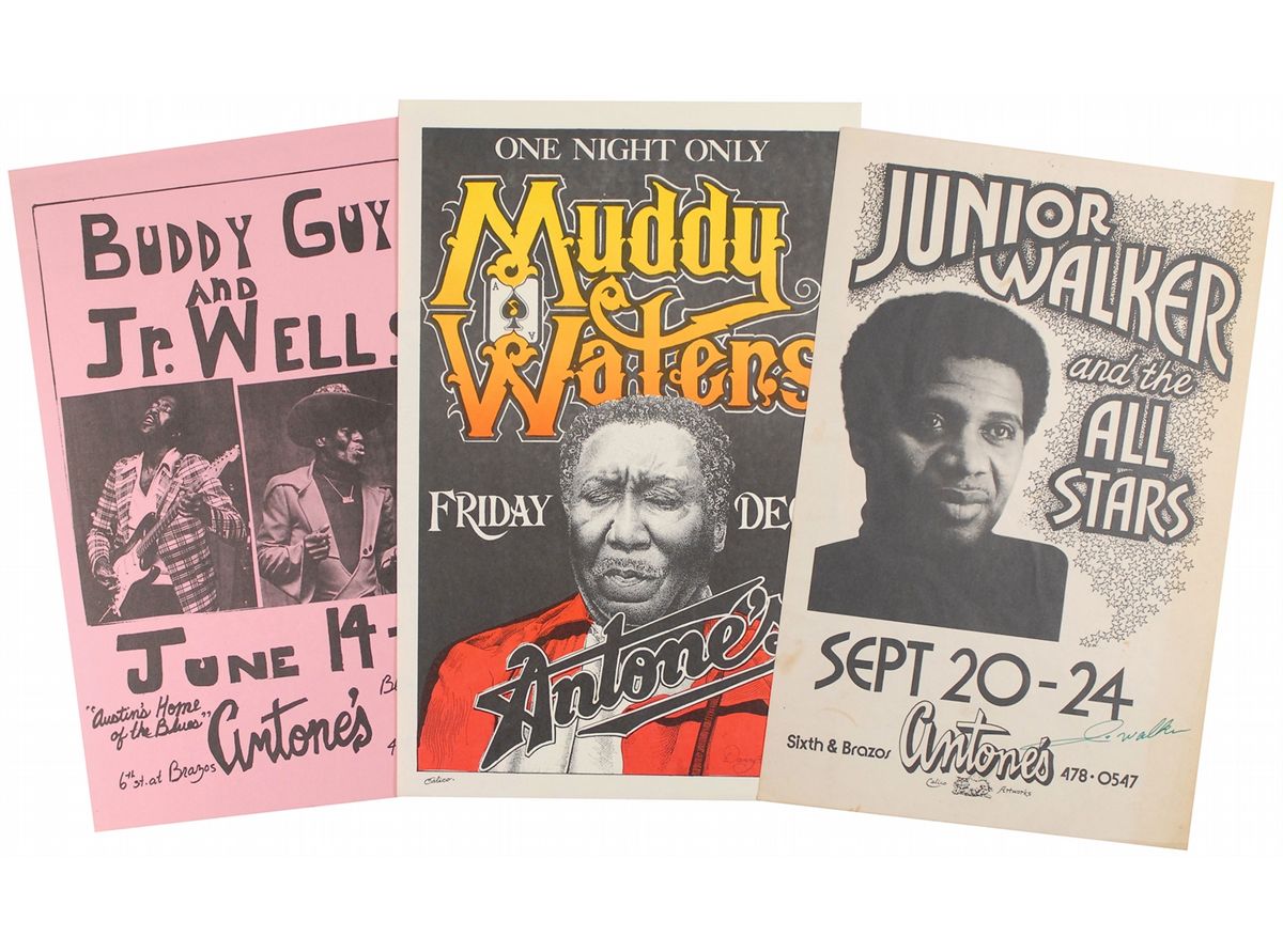 Three original posters (one signed) for performances by famous blues artists at Antone’s Nightclub in Austin, Texas, each measuring approximately 11 x 17, some dates unknown. Posters are for the following shows: Muddy Waters, December 7, 1978; Buddy Guy and Jr. Wells, June 14–18; and Junior Walker and the All Stars, September 20–24, signed in green felt tip by Walker. In overall fine condition, with a few stains and toning to the Walker poster. Originate from the personal collection of Clifford Antone, founder of the club.