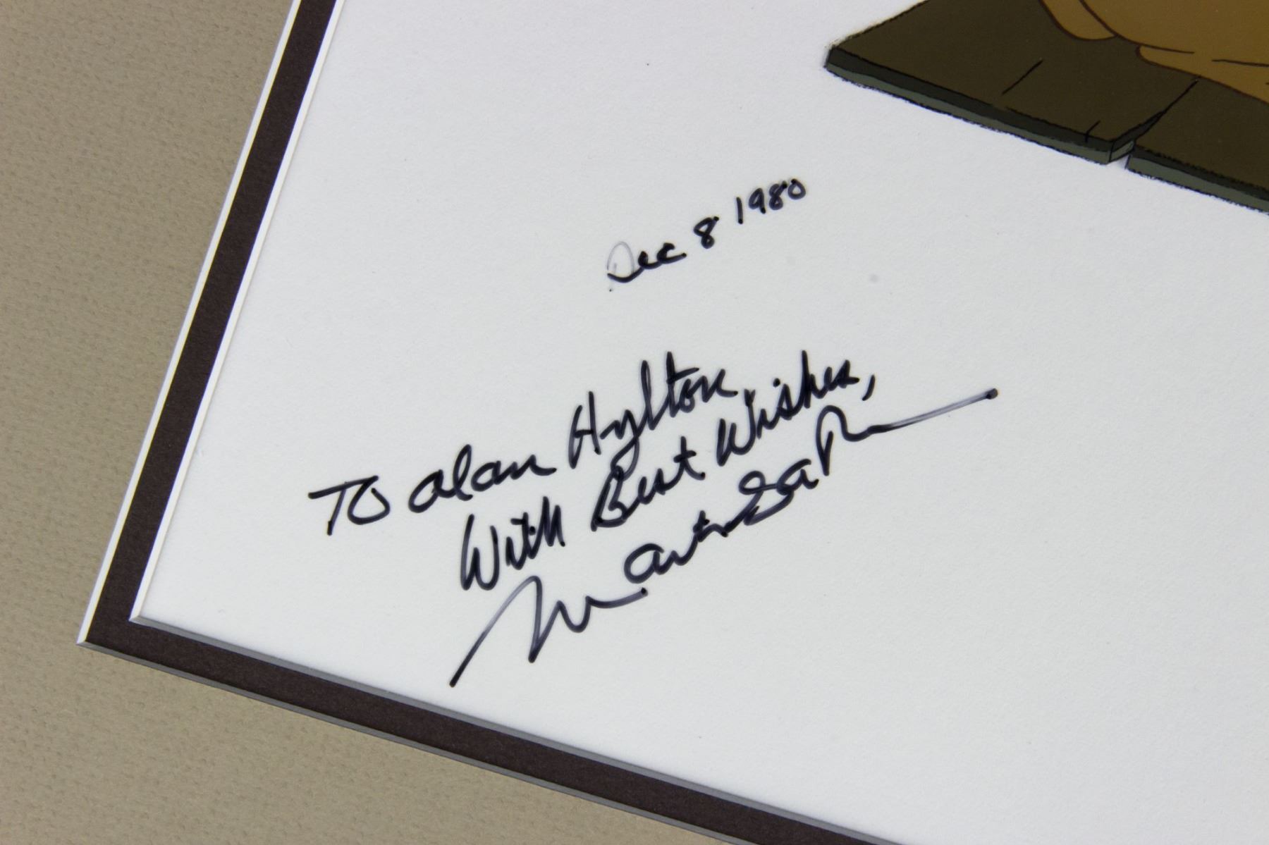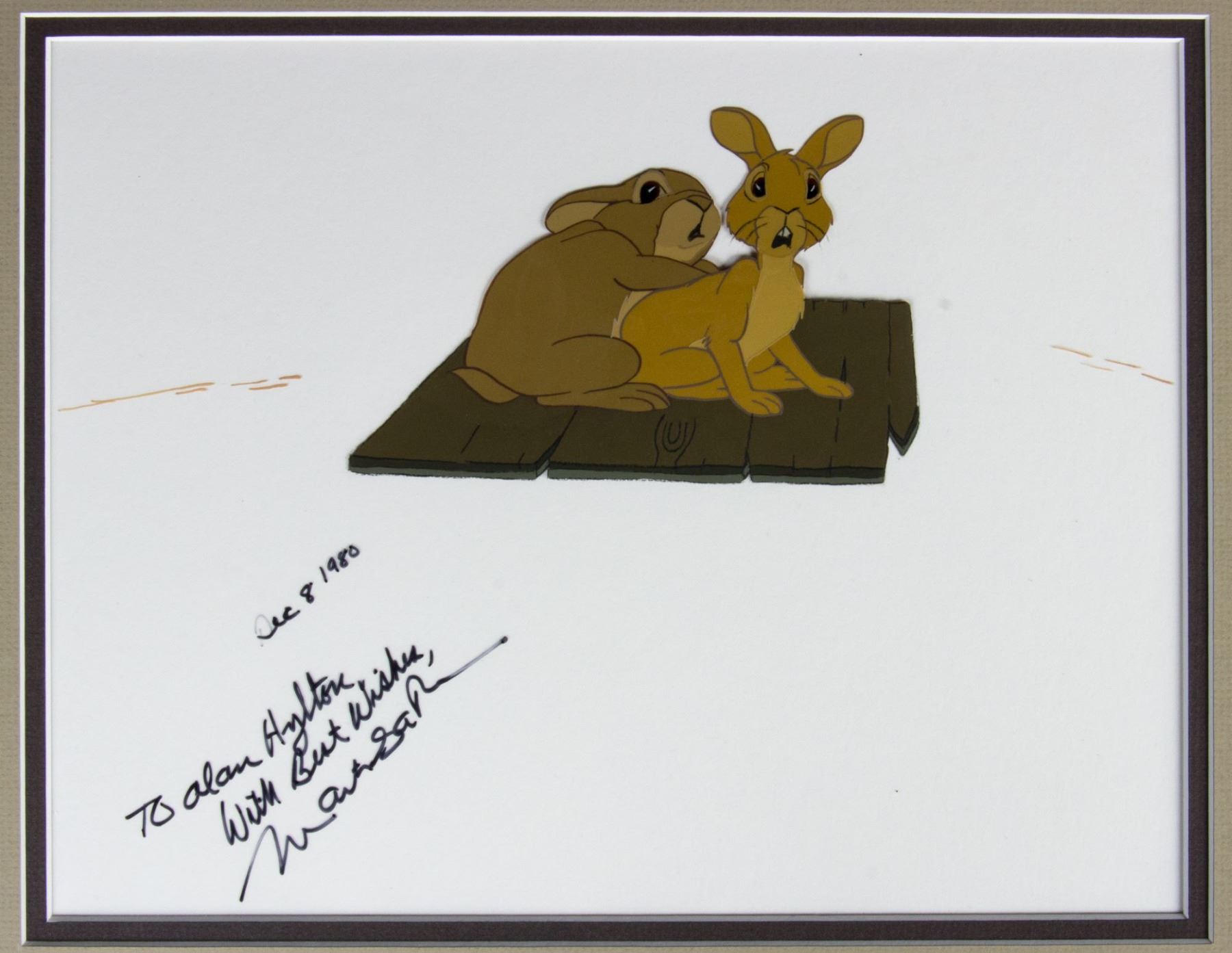 (CIC, 1978) A rare hand-painted original production cel from the animated feature film "Watership Down". The cel is signed by the film's Director Martin Rosen "To Alan Hylton, Best Wishes", and is dated Dec 8, 1980. The cel has an image size of 4"x6" and is matted to 14"x16". The condition is very good with minor wear from use.