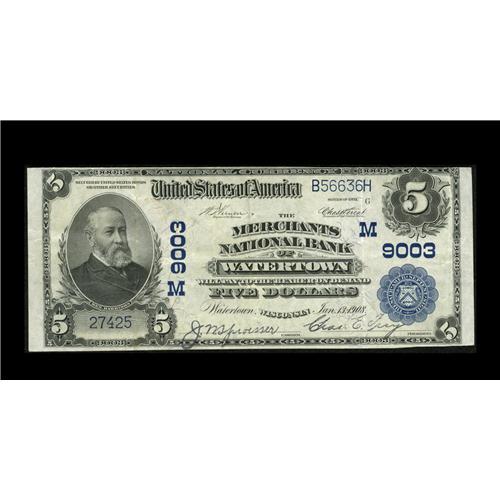 <B>Watertown, WI</B></I> - $5 1902 Plain Back Fr. 600 <B>The Merchants NB</B></I> Ch. # (M)9003<BR>A nice <B>Extremely Fine</B></I> from Jefferson County in Southeastern Wisconsin. The stamped signatures are quite strong and there is considerable crispness and brightness present here.