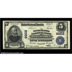 Watertown, WI - $5 1902 Plain Back Fr. 600 The Merchants NB Ch. # 9003An attractive large example which is considerably nicer than the average piece from here. Very Fine-Extremely Fine. Important notice: We expect to be auctioning lots at the rate of 200-250 per hour. Sometimes eBay Premier live bid software cannot keep up with that pace, so we strongly recommend that you place a realistic proxy bid now as insurance to avoid disappointment. Also please note that all Heritage/CAA lots purchased through eBay Premier carry a 20% Buyer's Premium. Please make sure you read the Terms and Conditions.