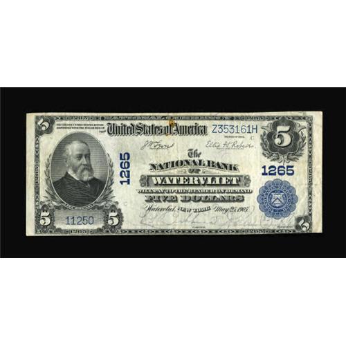 <B>Watervliet, NY</B></I> - $5 1902 Plain Back Fr. 598 <B>The NB of Watervliet</B></I> Ch. # 1265<BR> A more than acceptable circulated example from this Albany County bank. <B>Fine+.<BR></B></I><I>From The Thomas A. Bergin Collection</B></I><BR><BR><b>Shipping:</b> Coins & Currency (<a target="_blank" href="http://www.heritageauctions.com/common/shipping.php">view shipping information</a>)