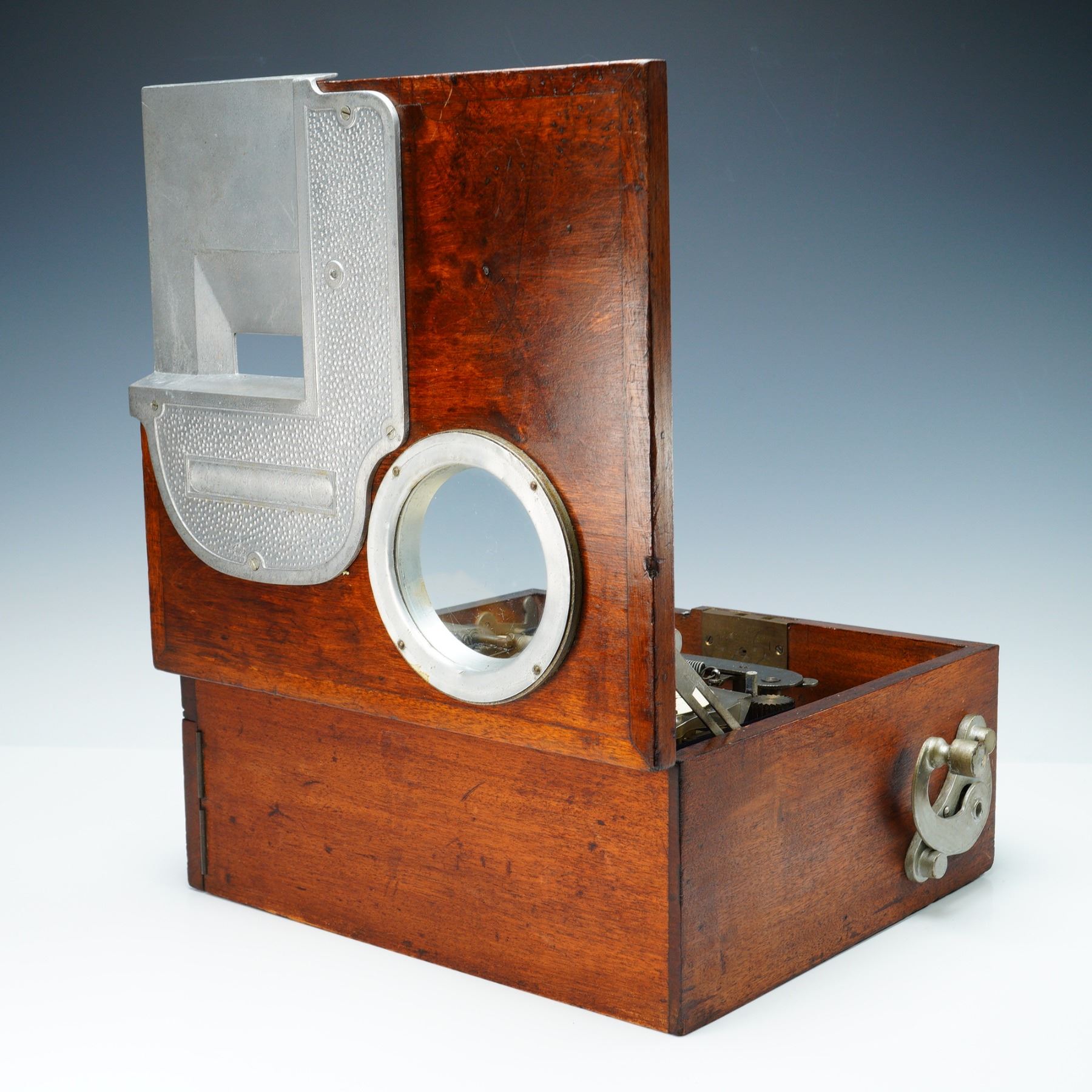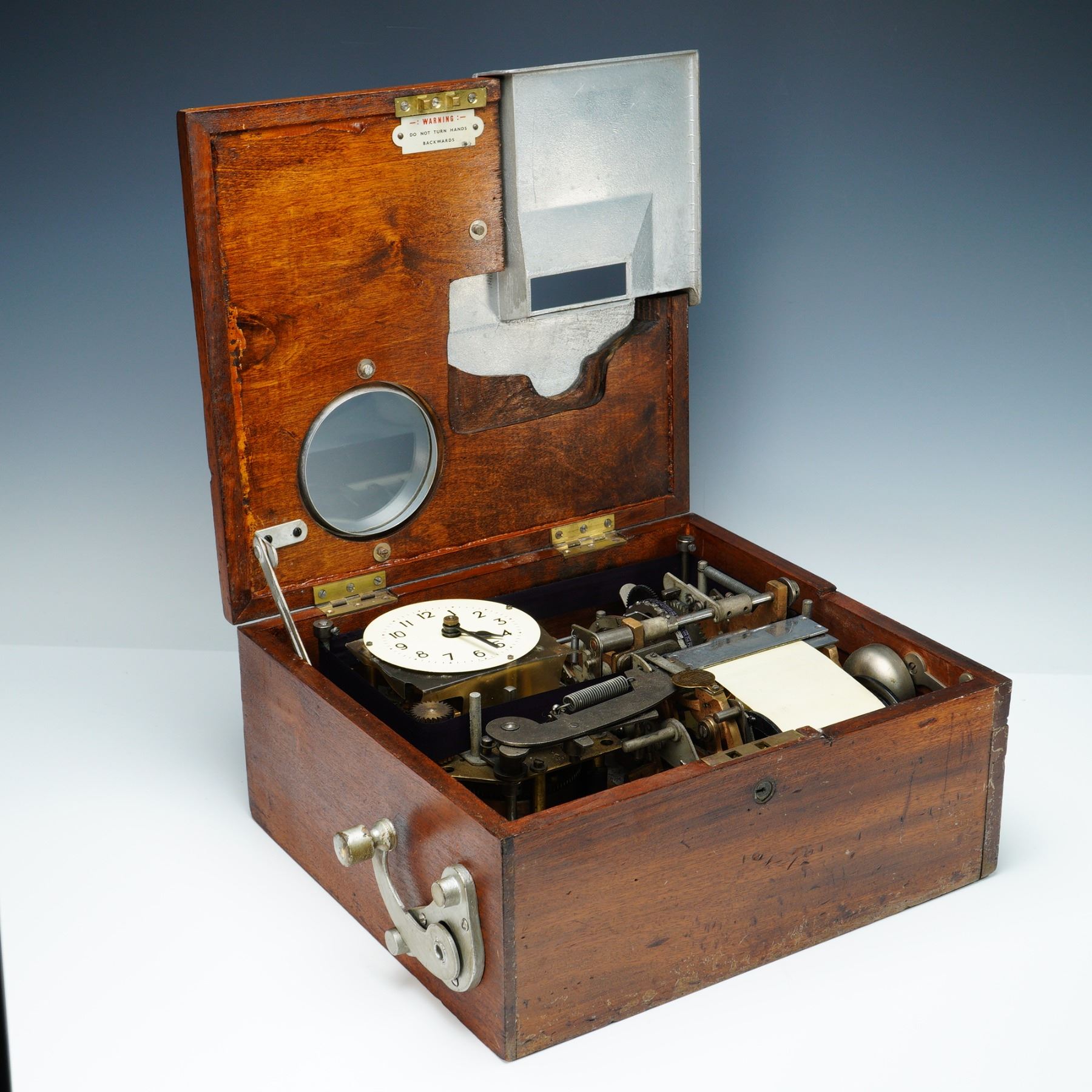 An early Watkins Time Recorder, made in England, circa early 20th century. This fascinating industrial artifact features a mahogany case with a nickel-plated mechanical punch mechanism, hinged front lid with glass viewing window, and a manual lever system for time stamping employee cards. The interior houses an intricate arrangement of gears, rollers, and a numbered date ribbon, alongside a secondary dial and a brass control plate marked "Hour Change - One Minute Past Hour Pull Lever Once to Advance Each Hour." The primary clock dial is marked "Made in England" and the inner maker's plate reads "Watkins - 89 High Street, Aldersgate, London." This piece exemplifies early 20th century advancements in workforce management and precision mechanics, blending functional ingenuity with period craftsmanship. Good overall condition with light wear consistent with age. Mechanism and components appear complete; untested for working order. Retains an attractive aged patina to both metal and wood surfaces.