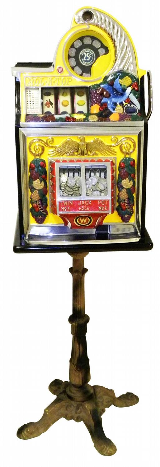 Watling Roll a Top Bird of Paradise, 25 cent three reel slot machine. Earlier restoration, excellent working condition. Comes with keys and cast iron stand.