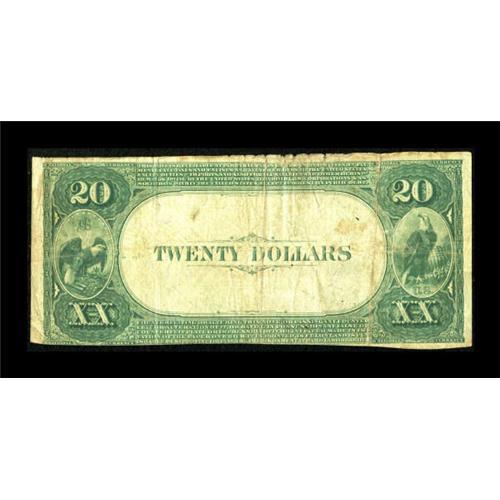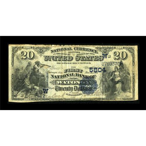 <B>Watonga, OK</B></I> - $20 1882 Value Back Fr. 583 <B>The First NB</B></I> Ch. # (W)5804<BR> This newly discovered example walked into our offices late last year, and is offered here to the numismatic community for the first time. It comes from one of the most difficult to obtain towns in Oklahoma, a one bank community with just three notes, two Territorials and one state issue, making up the entire census. The state note and one of the Territorials have never been previously offered to collectors at public sale, and the sole appearance of the other Territorial came in 2006, when, grading just Fine, it realized $37,950 at auction. This specimen also grades <B>Fine, </B></I>and is a problem free piece with good color, signatures, and appearance for the grade. Expect some serious bidding before the hammer falls tonight, as collectors vie for the satisfaction of adding a new town to their holdings. <BR><BR><b>Shipping:</b> Coins & Currency (<a target="_blank" href="http://www.heritageauctions.com/common/shipping.php">view shipping information</a>)
