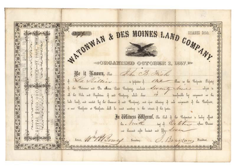 1857, Iowa. Stock certificate for one share. Black / White. Vignette of an eagle atop and American flag with a ship and factory in background at top center. Ornate left border. Toning at folds and edges. Uncancelled and Fine.