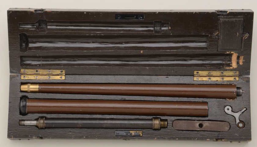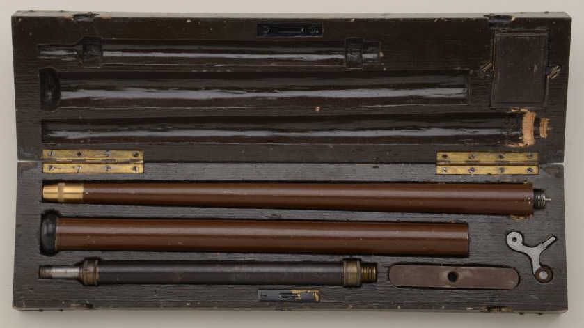 Watson & Son London marked air gun with pump and cocking key, in period handmade wood carrying case. The gun is approximately .32 cal. smooth bore, made in 2 sections and painted to resemble wood cane. The air gunmeasures approximately 36" when assembled and remains in very good+ to near fine condition with original end piece and loader. The wood case is nicely made and in good condition. The mechanism is working and this is a powerful air gun that would shoot a lead ball. These were a favorite of poachers for small birds and game, circa about 1860s-1880s. Est.: $2,250-$4,500