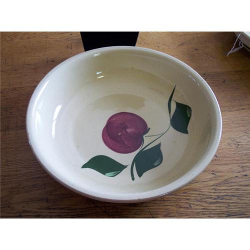 Watt Oven-Ware Spaghetti Apple bowl.Great bowl. This bowl has one chip-hole in the middle of the inside and sime spider web marks on base that do not go through.Measures 13" across top.