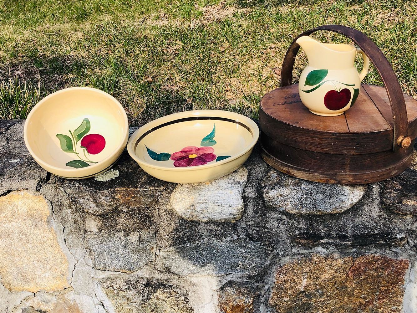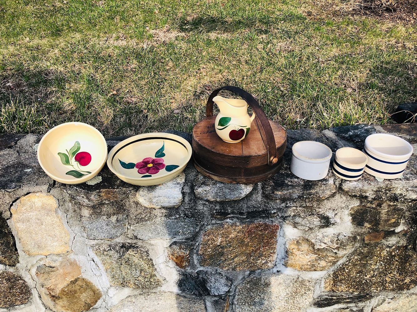 Vintage country collectibles lot includes Watt Bowls and pitcher, wooden cheese holder, and 3 small butter crocks.