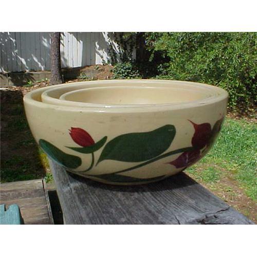 Marked numbers 52,53, and 54 and Oven Ware USA this group of three Watt nesting bowls are in the Starflower pattern. The bowls measure 8 1/2, 8, and 7 1/2 inches across. There is some crazing on the bowls, a little on the two smaller bowls and more on the largest bowl. Each has some glaze pops but there are no chips or cracks. Buyer pays $18.00 shipping for this unusual find.