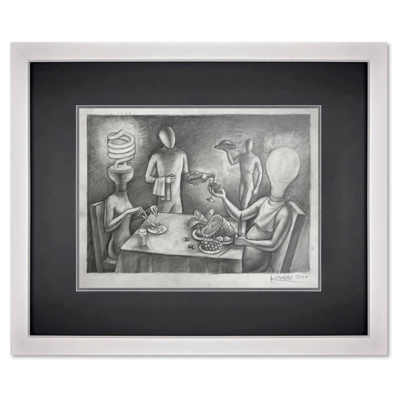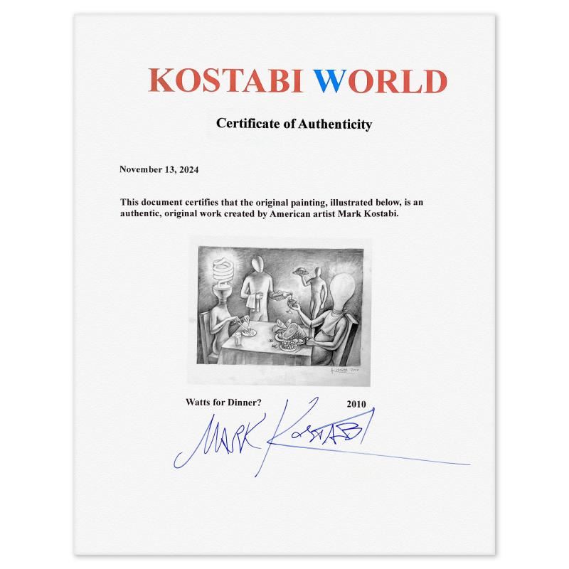 "Watts For Dinner" is an original drawing on paper by Mark Kostabi, hand signed by the artist. This piece comes custom framed. Includes Certificate of Authenticity. Measures approx. 17" x 20" (frame), 11" x 14" (image). This item requires special handling and may have a longer than usual turnaround.