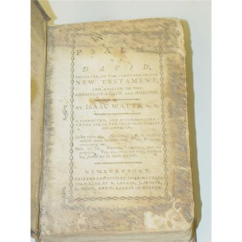 Watts, Isaac. Two Books in One as Listed Below. Newburyport: Printed and Sold By John Mycall, 24mo - over 5" - 5¾" tall. Hard Cover. Fair to Good Condition. ND-circa 1780. THIS IS NOT AN EX-LIBRARY BOOK. ***The Psalms of David, Imitated, in the Language of the New Testament, and Applied to the Christian State and Worship. 288pp with insect damage to lower corner of first few leaves, not affecting the text. ***Hymns and Spiritual Songs, in Three Books. 246pp, 9 Table, 9 Table. In leather over wood binding, with raised bands on spine. Leather chips, lacks free endpapers, light foxing. binding tight