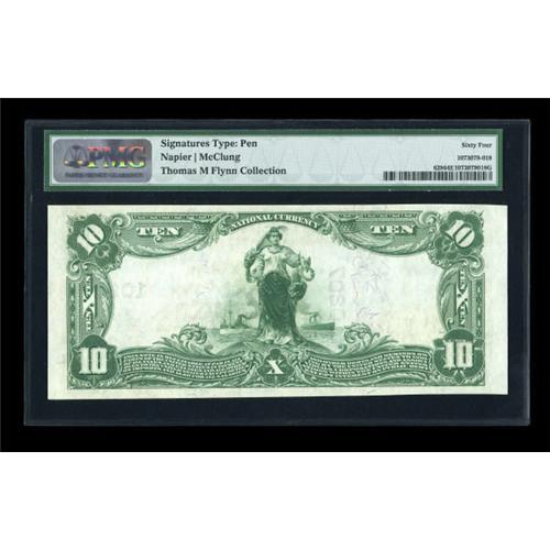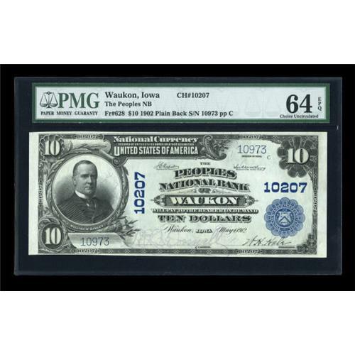 <B>Waukon, IA</B></I> - $10 1902 Plain Back Fr. 628 <B>The Peoples NB</B></I> Ch. # 10207<BR> A lovely note from the later of Waukon's two issuing banks, both of which issued large notes only. Bright PMG <B>Choice Uncirculated 64 EPQ, </B></I>with one stamped and one pen signature. <BR><I>From The Thomas M. Flynn Collection</B></I><BR><BR><b>Shipping:</b> Coins & Currency (<a target="_blank" href="http://www.heritageauctions.com/common/shipping.php">view shipping information</a>)