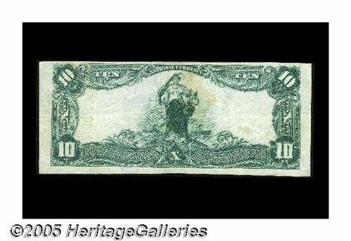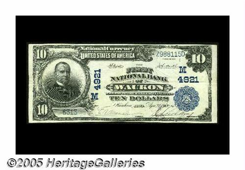 <B>Waukon, IA</B></I> - $10 1902 Plain Back Fr. 630 <B>The First NB</B></I> Ch. # 4921<BR>This institution issued large notes only prior to failing in 1926. This is one of the nicest from here. With delicate black officers' signatures, it grades an appealing <B>Very Fine-Extremely Fine</B></I> and last appeared in our FUN 2004 sale, where it sold for $1,380, a figure it should approximate again tonight.