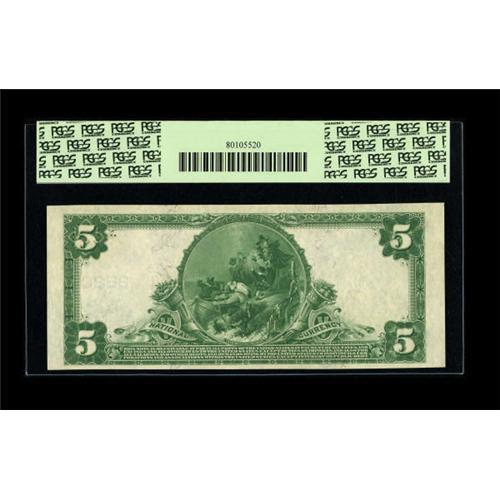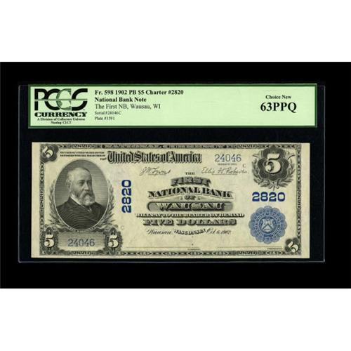 <B>Wausau, WI</B></I> - $5 1902 Plain Back Fr. 598 <B>The First NB</B></I> Ch. # 2820<BR> While small examples from here exist in hoard quantities, large examples, particularly in high grade, are not at all common. Bright paper and nicely embossed surfaces adorn this <B>PCGS Choice New 63PPQ </B></I>specimen.<BR><I>From The Kansas City Collection.</B></I><BR><BR><b>Shipping:</b> Coins & Currency (<a target="_blank" href="http://www.heritageauctions.com/common/shipping.php">view shipping information</a>)