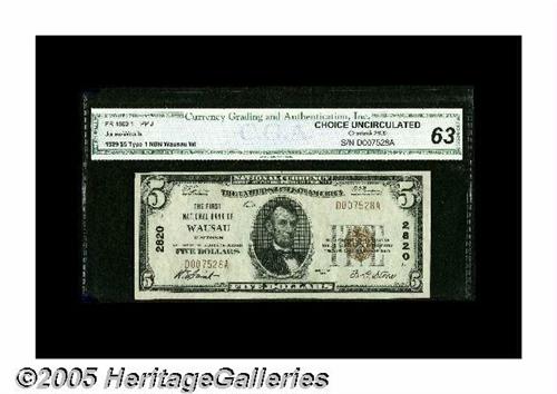 <B>Wausau, WI</B></I> - $5 1929 Ty. 1 <B>The First NB </B></I> Ch. # 2820<BR><B>CGA Choice Uncirculated 63.</B></I> A bright example of <I>the</B></I> note for type in the 1929 series from Wisconsin. Notes in uncirculated condition from here were preserved in some abundance by an earlier generation.