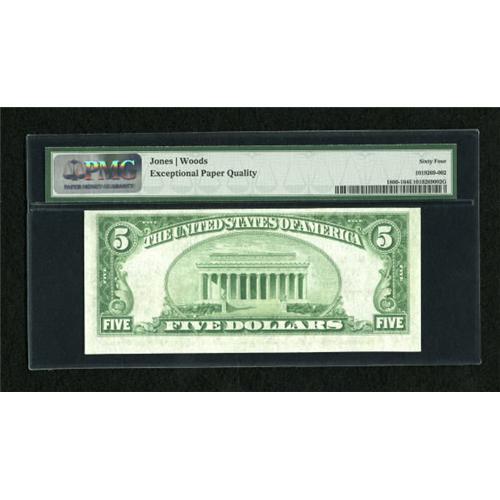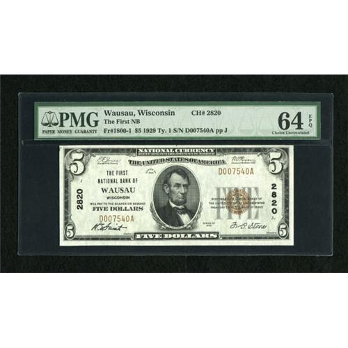 <B>Wausau, WI</B></I> - $5 1929 Ty. 1 <B>The First NB</B></I> Ch. # 2820<BR> Nicely embossed with fresh inks though the centering is a touch off. <B>PMG Choice Uncirculated 64 EPQ.</B></I><BR><BR><b>Shipping:</b> Coins & Currency (<a target="_blank" href="http://www.heritageauctions.com/common/shipping.php">view shipping information</a>)