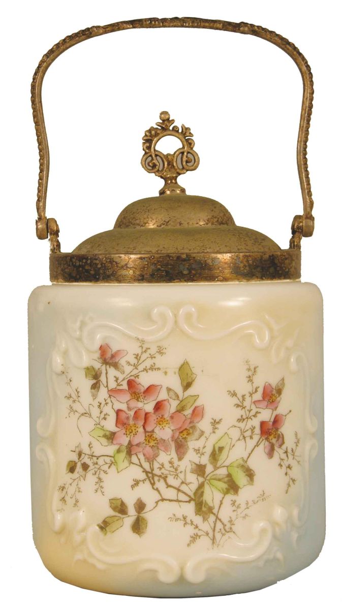 Wave Crest Biscuit Jar. Embossed pale blue and yellow colored floral design. No chips or cracks, excellent condition. 8 inches tall w/o bail.