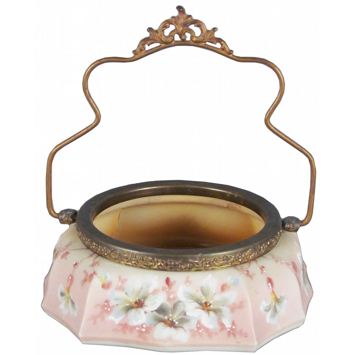 Wave Crest Bon Bon Server. Pink with pale blue floral pattern. Marked Nakara, C.F.M. Company. No chips or cracks. 6 1/4 inches tall with bale X 5 3/4 inch diameter.