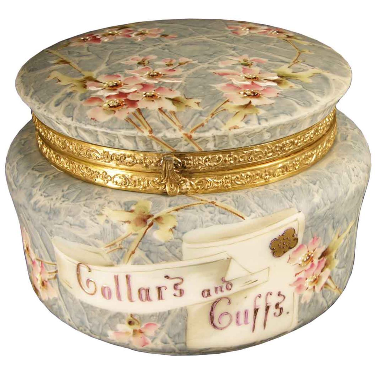 Wave Crest Collar & Cuffs Dresser Box. Extremely rare. Pictures of collars and cuffs on front, blue water mark back ground with pink flowers. Marked Kelva. No chips or cracks. 5 1/2 inches tall X 8 inch diameter.