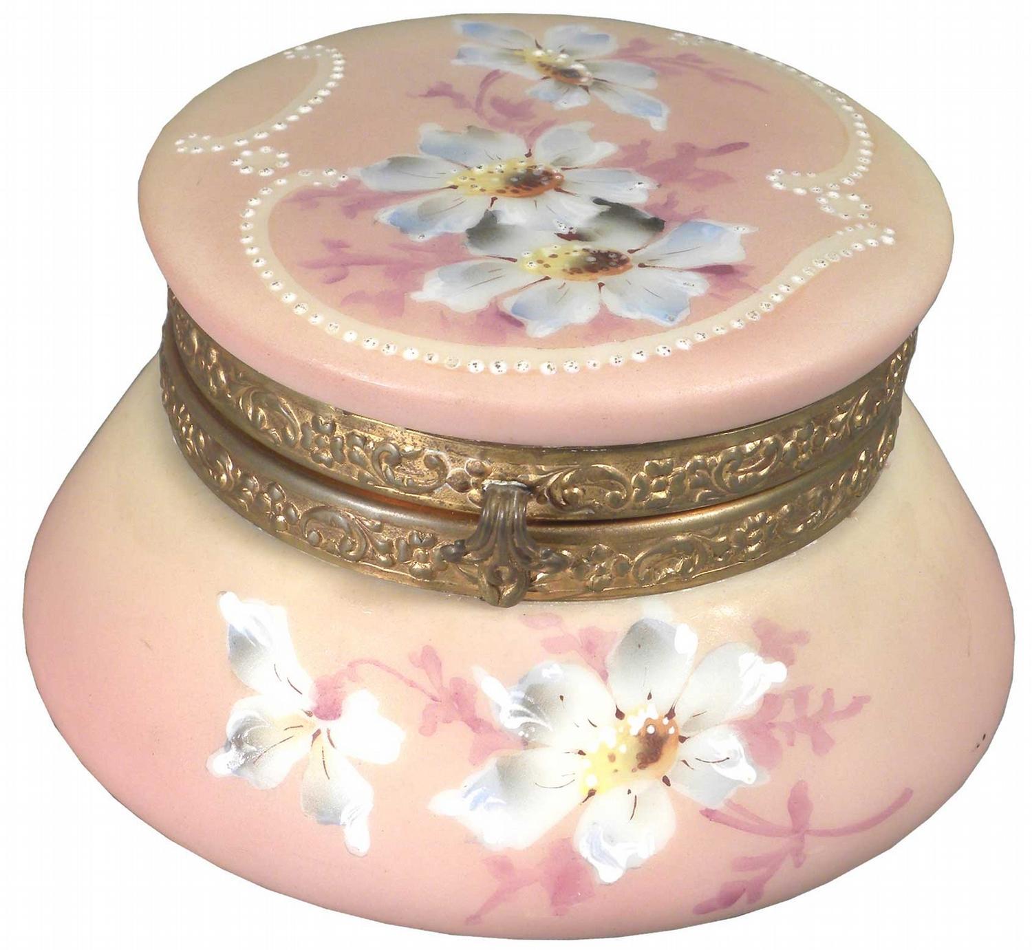 Wave Crest Decorated Opal Handerkerchief Box. Mauve with light blue flowers and beaded enamel detail, original silk lining. Marked Nakara C.F.M. Co. No chips or cracks. 4 3/4 inch diameter X 3 1/2 inches tall.