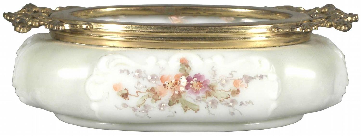 Wave Crest Decorated Opal Trinket Tray. Raised rococo pattern on each side with pink/purple floral motif and ormulu trim. Wave Crest hallmark on bottom. 5 3/4 X 1 3/4 X 3 3/4 inches.
