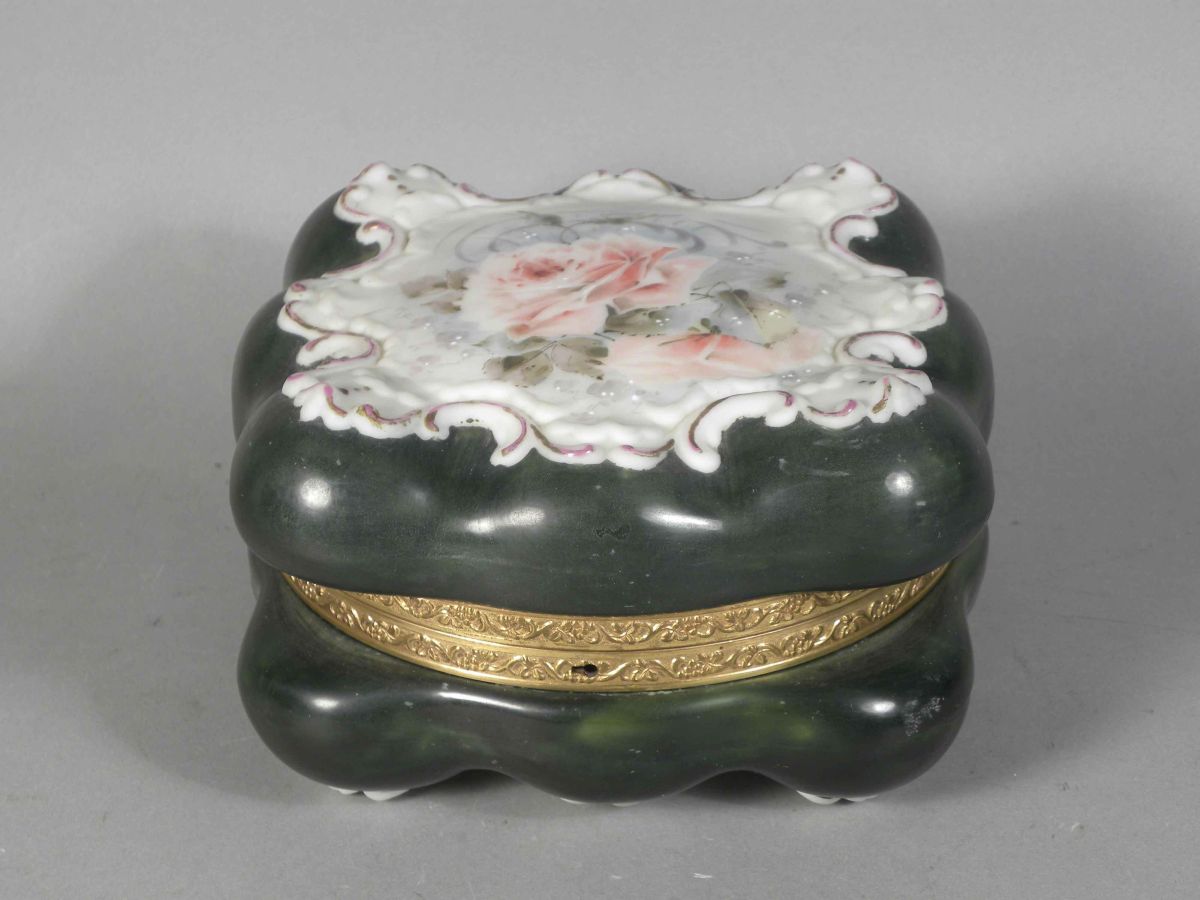 Wave Crest Dresser Box. Stamped Wave Crest. Sage green with white and blue floral lid. No chips or cracks, excellent condition. 7 1/4 X 3 1/4 X 7 1/4 inches.