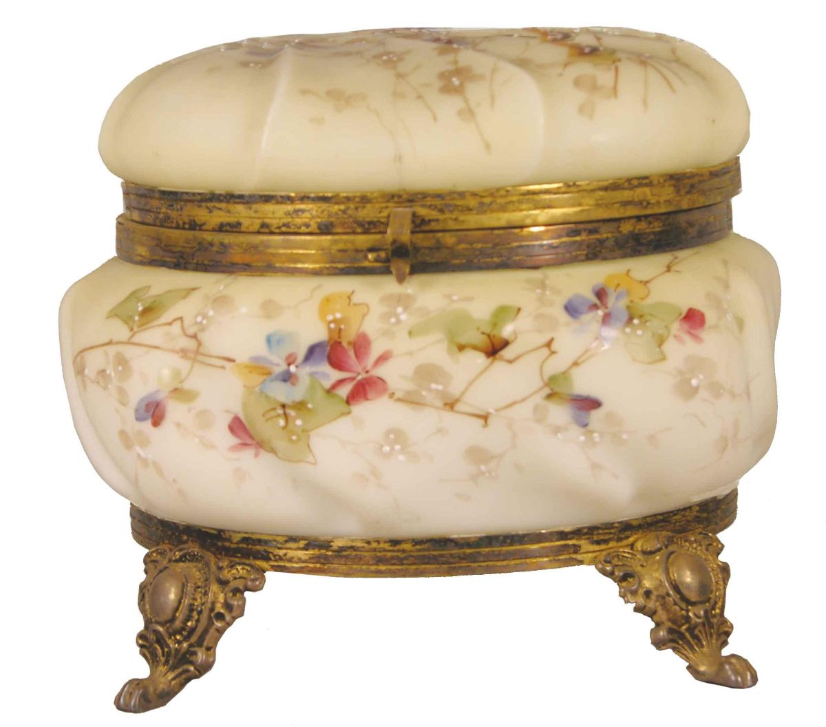 Wave Crest Dresser Box. Swirl pattern, floral décor, satin lining and footed base. Unmarked, no chips or cracks, excellent condition. 7 X 6 X 7 inches.