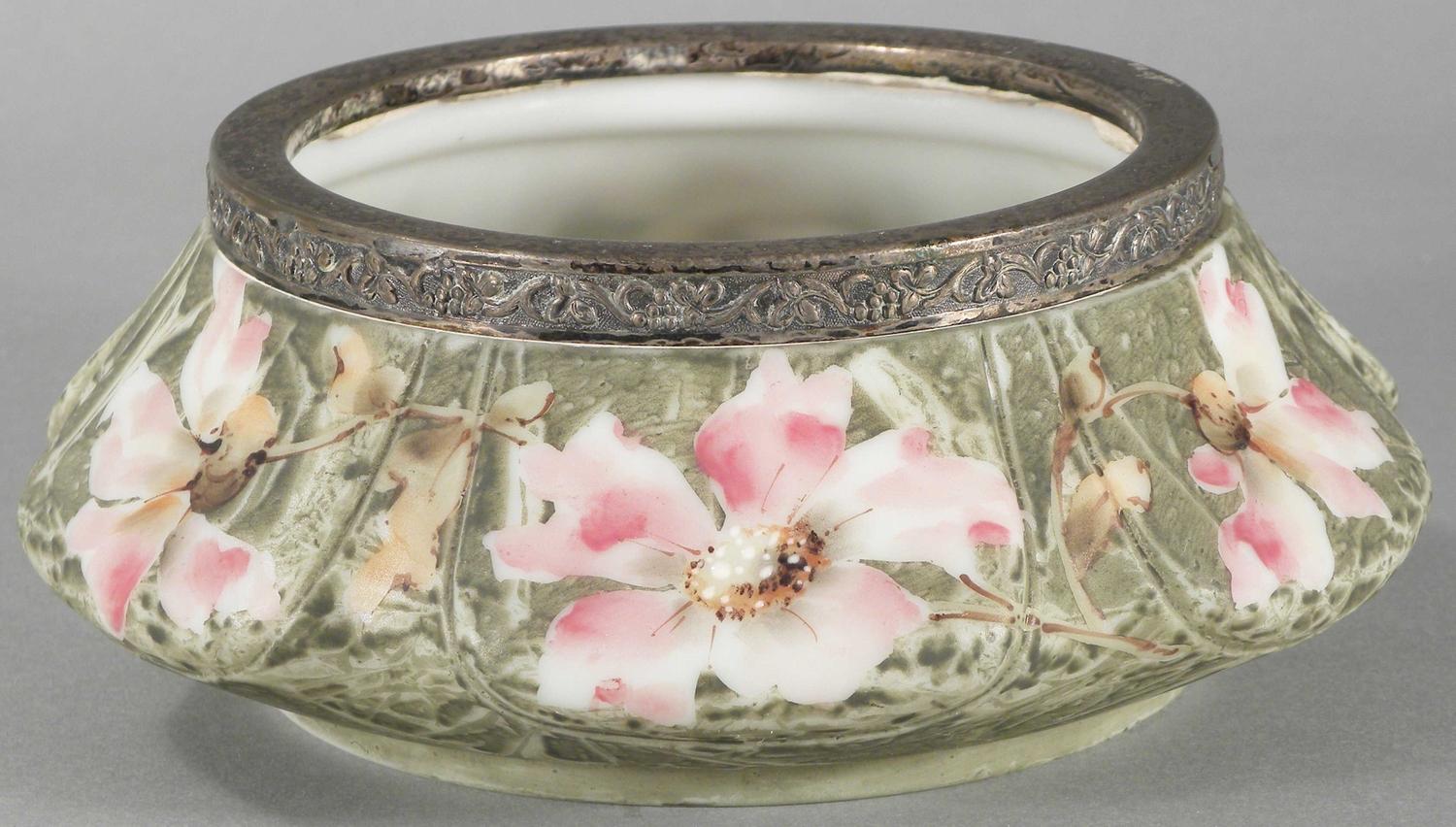 Wave Crest Ferner. Green with pink flowers and metal rim. Marked Kelva. No chips or cracks. 6 1/2 inch diameter X 2 1/2 inches tall. Start Price $100