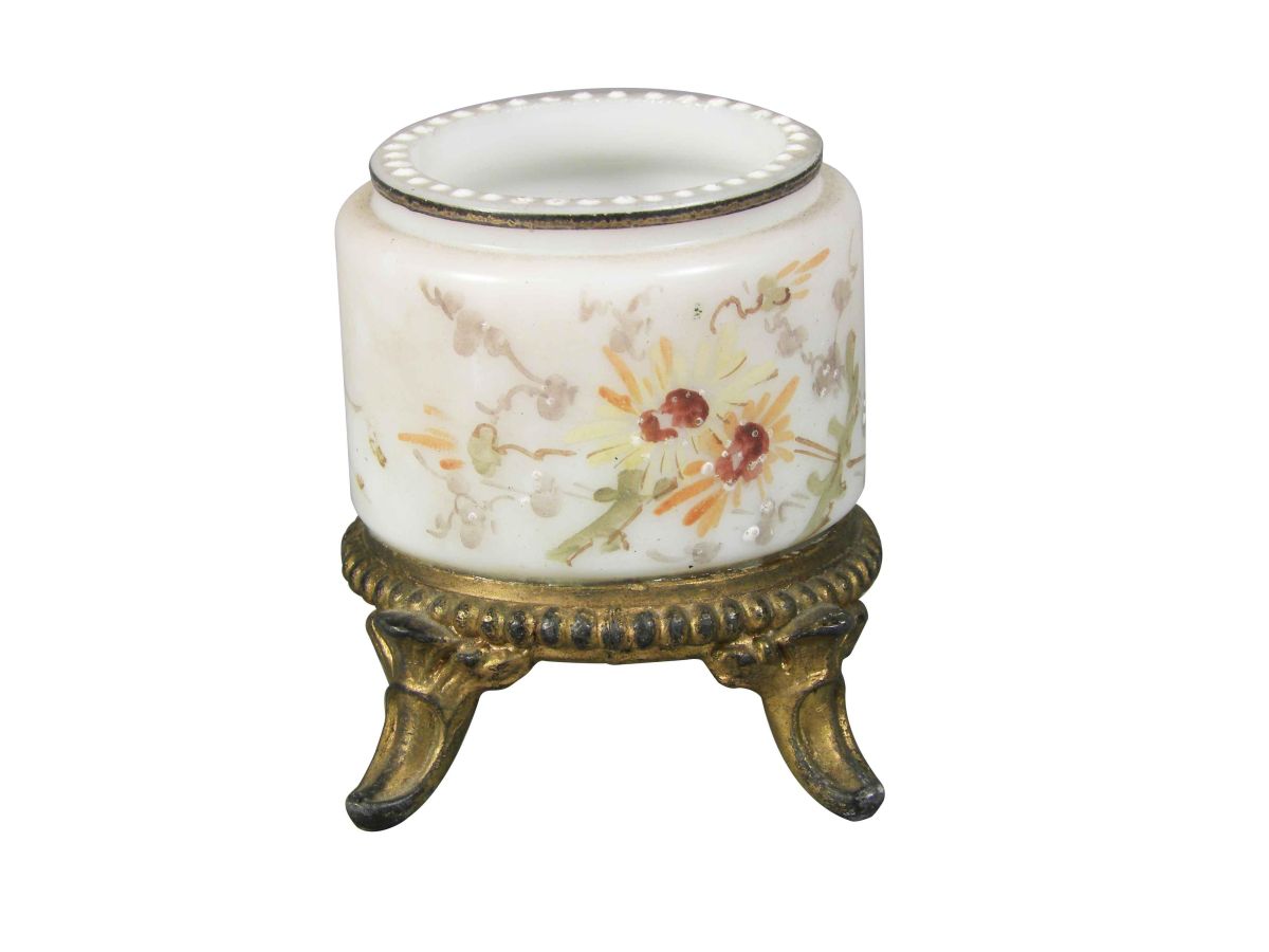 Wave Crest Footed Tooth Pick Holder. Marked with Wave Crest Hallmark. Beaded rim, pink w/ yellow and orange flowers. No chips or cracks, excellent condition. 1 7/8 X 2 1/4 X 17/8 inches.