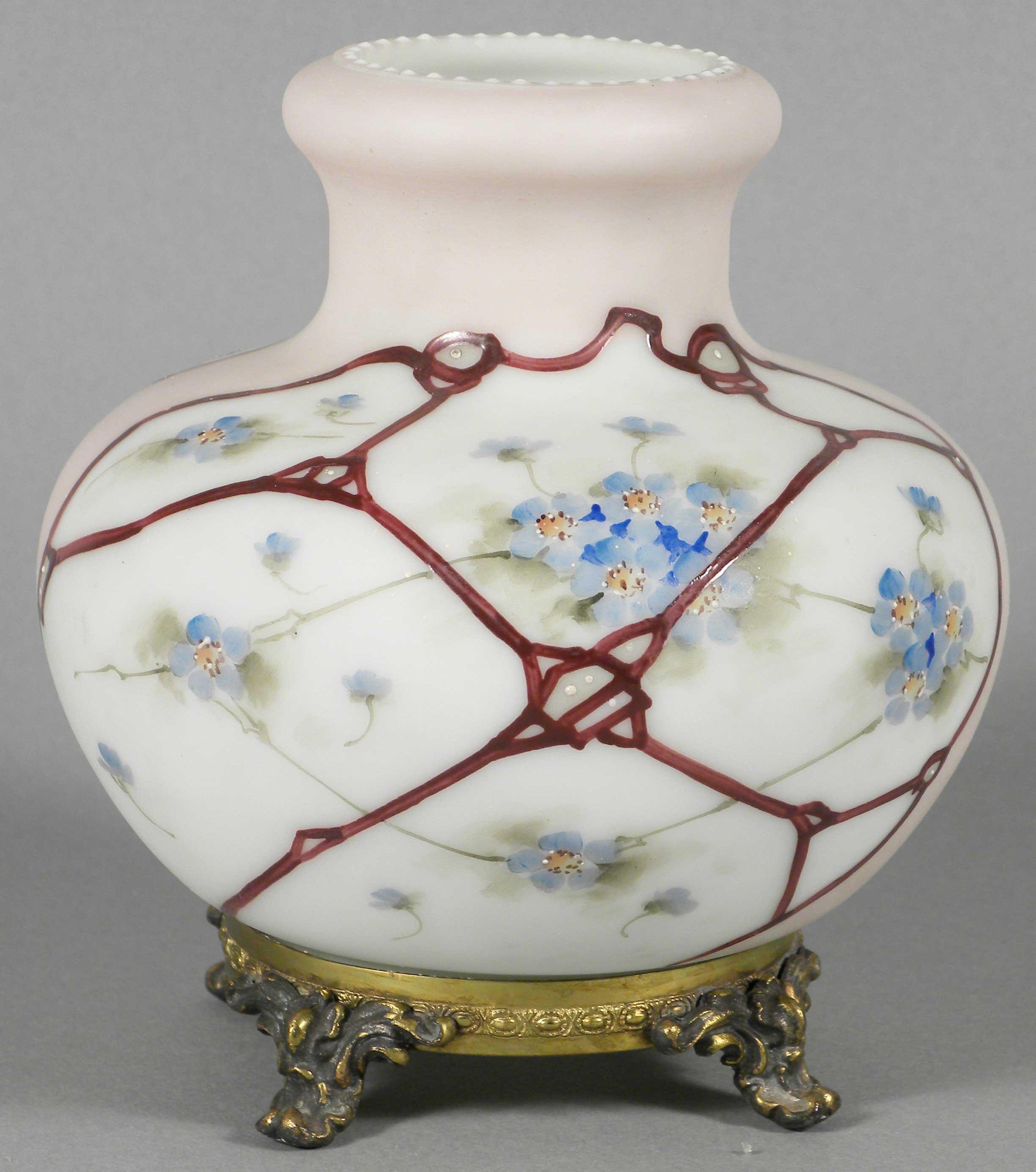 Wave Crest Footed Vase. Unusual enamel outline on design. Pale pink back ground with forget-me-not flowers. Unmarked, no chips or cracks. 5 inches tall. Start Price $100
