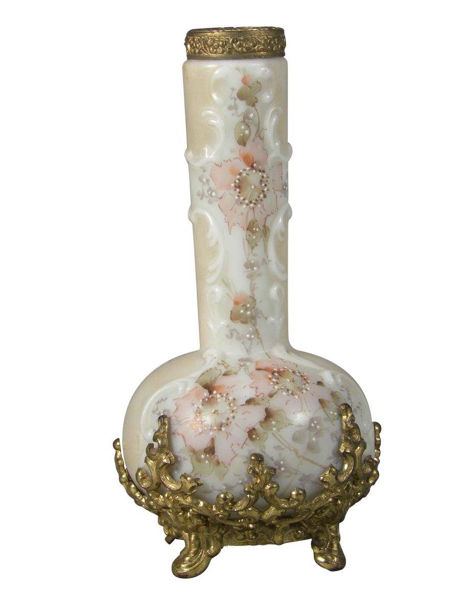 Wave Crest Footed Vase and metal rim. Marked with Wave Crest Hallmark. Tan/white with pink flowers. No chips or cracks, excellent condition. 7 1/4 inches tall.