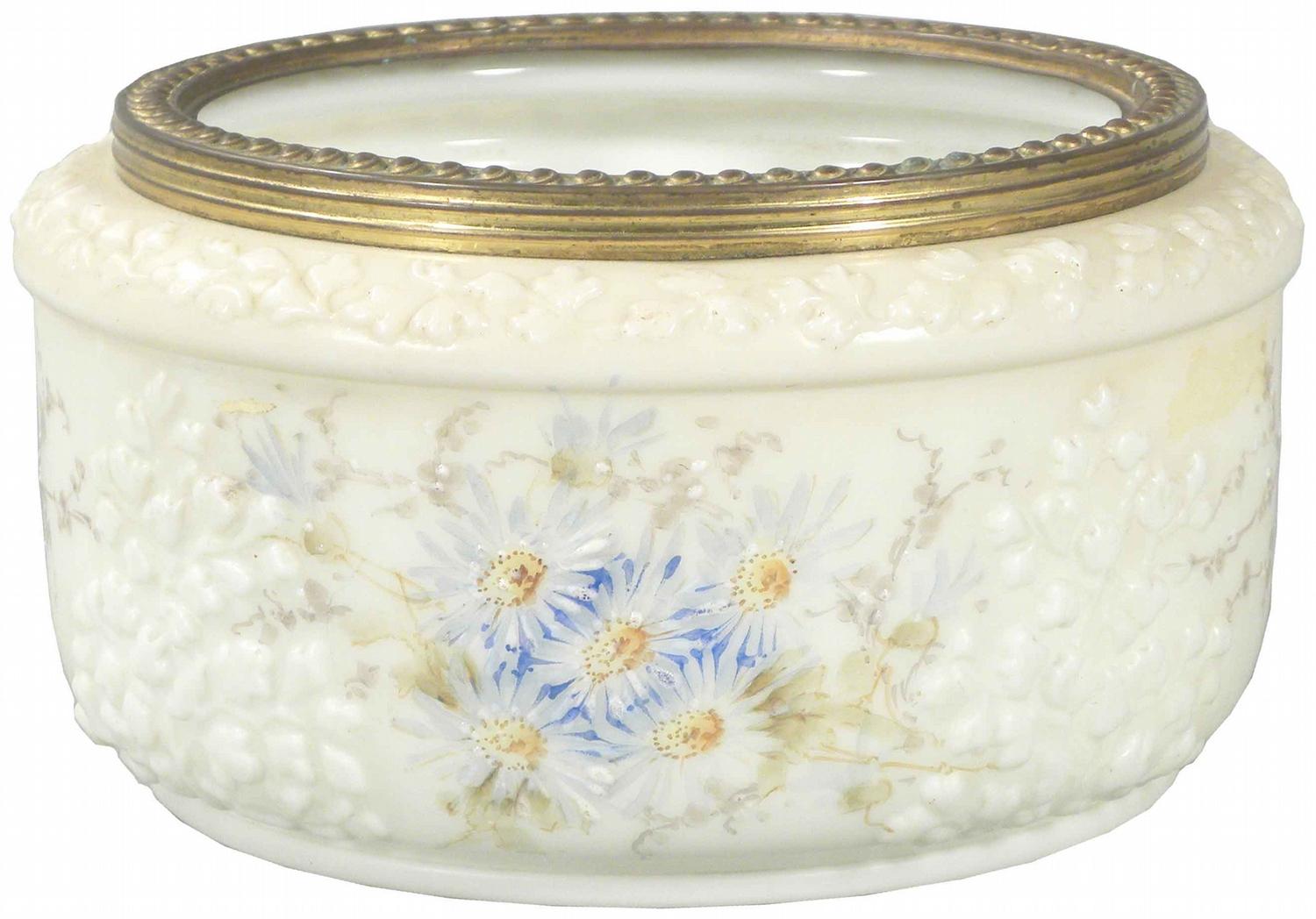Wave Crest Furner. Embossed and enameled daisy floral pattern with brass trim. Wave Crest Hallmark on bottom. No chips or cracks. 7 1/2 inch diameter X 4 1/4 inches tall.