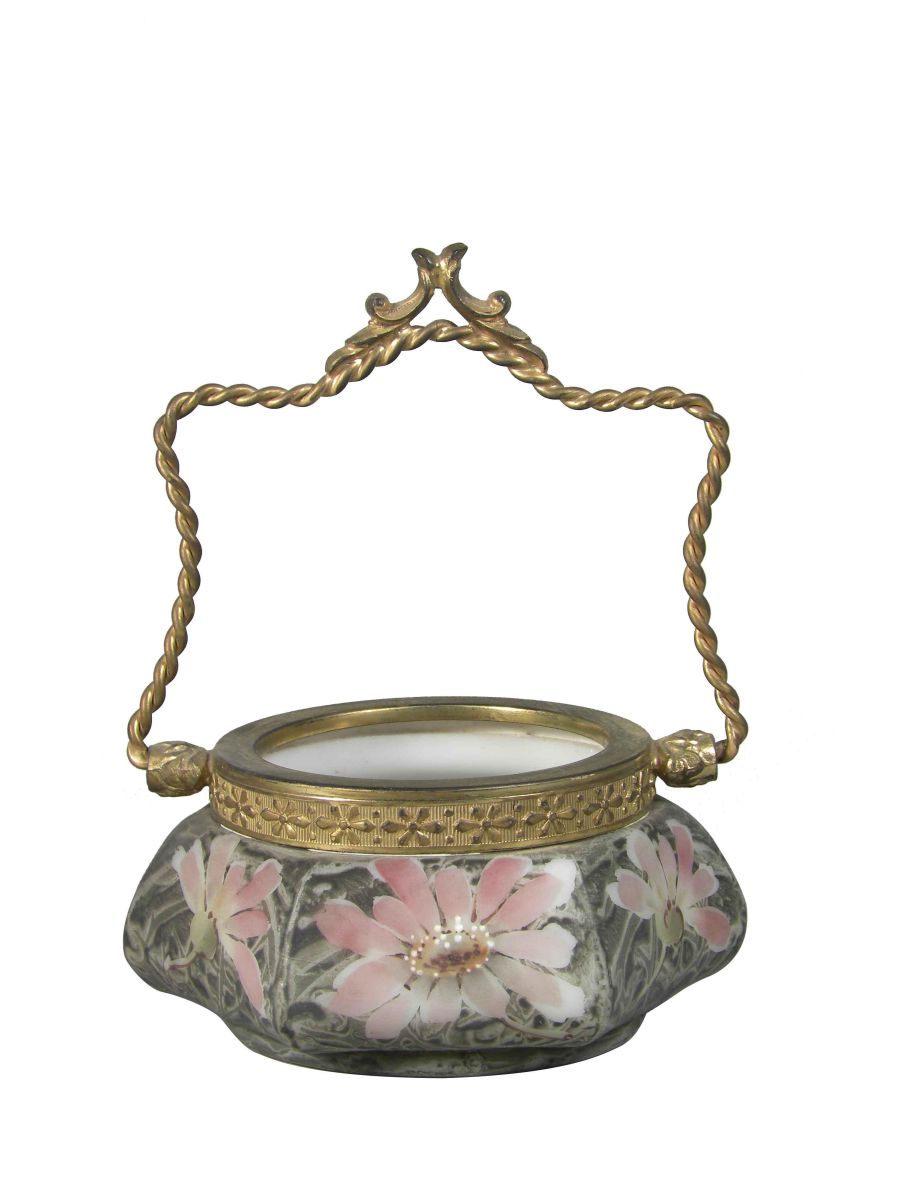 Wave Crest Hair Pin Holder w/bale. Marked Kelva. Dark green with pink flowers. No chips or cracks, excellent condition. 4 X 2 X 4 inches.