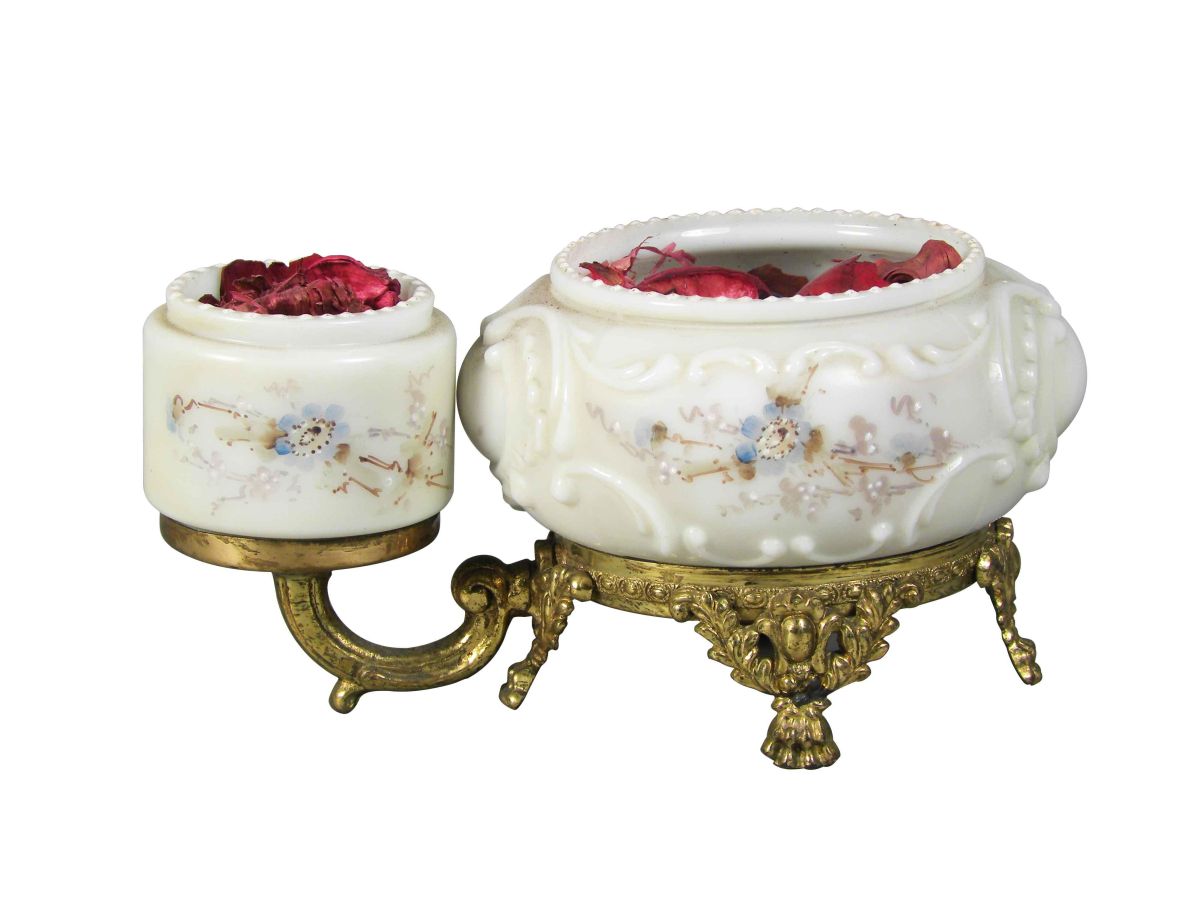 Wave Crest Hair Receiver/Pin Holder. Marked Wave Crest. White w/ blue flowers. Footed, pieces are connected. No chips or cracks, excellent condition. 5 1/2 X 3 X 3 1/2 inches.