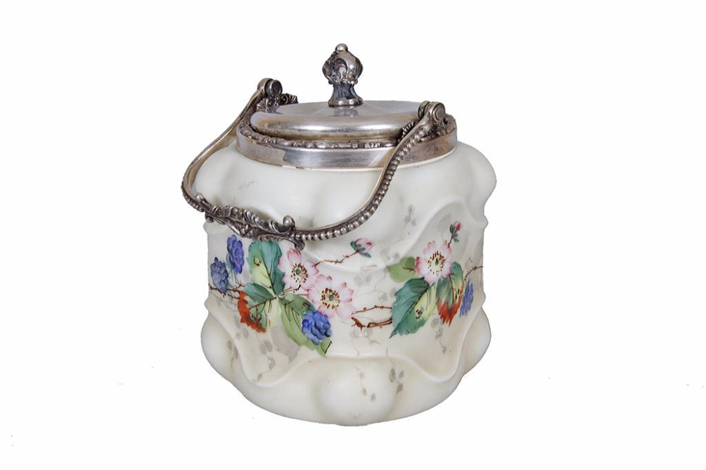 Wave Crest Hand Painted Biscuit Jar Has floral motif, silver plated handle and lid, measures 7"x5".Has floral motif, silver plated handle and lid, measures 7"x5".