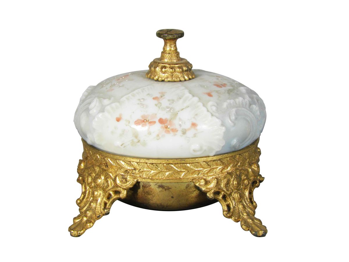 Wave Crest House Bell, unmarked. Footed, turn knob to ring bell. No chips or cracks, excellent condition. 3 3/4 inch diameter.