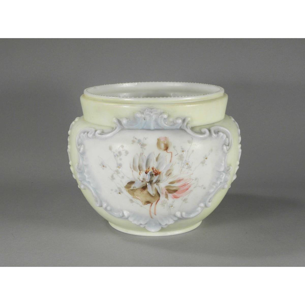Wave Crest Jardinière. Hallmark stamp on bottom. High relief pale green and blue floral. No chips or cracks. 9 inch diameter X 7 inches tall.