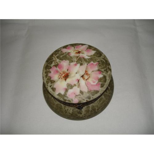 The stunning Kelva dark green moulted background round box has blown out multi-colored pink roses, with bronze, brown and white speckled centers. The silver banding has a beautiful patina. The hinge and clasp are tight and good working condition. The interior is as perfect as the outside. Kelva box measures 2-1/2"h x 4-1/2"w and in excellent condition, considering its age! The box has a Trade Mark Kelva in red stamp on bottom. This Kelva Box is truly a beautiful piece!