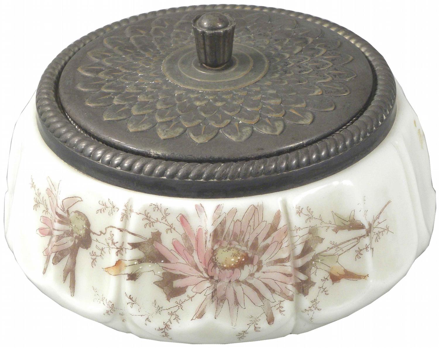 Wave Crest Bon Bon Jar. Embossed mum top and pink floral pattern on white. No chips or cracks. 8 inch diameter X 6 inches tall.