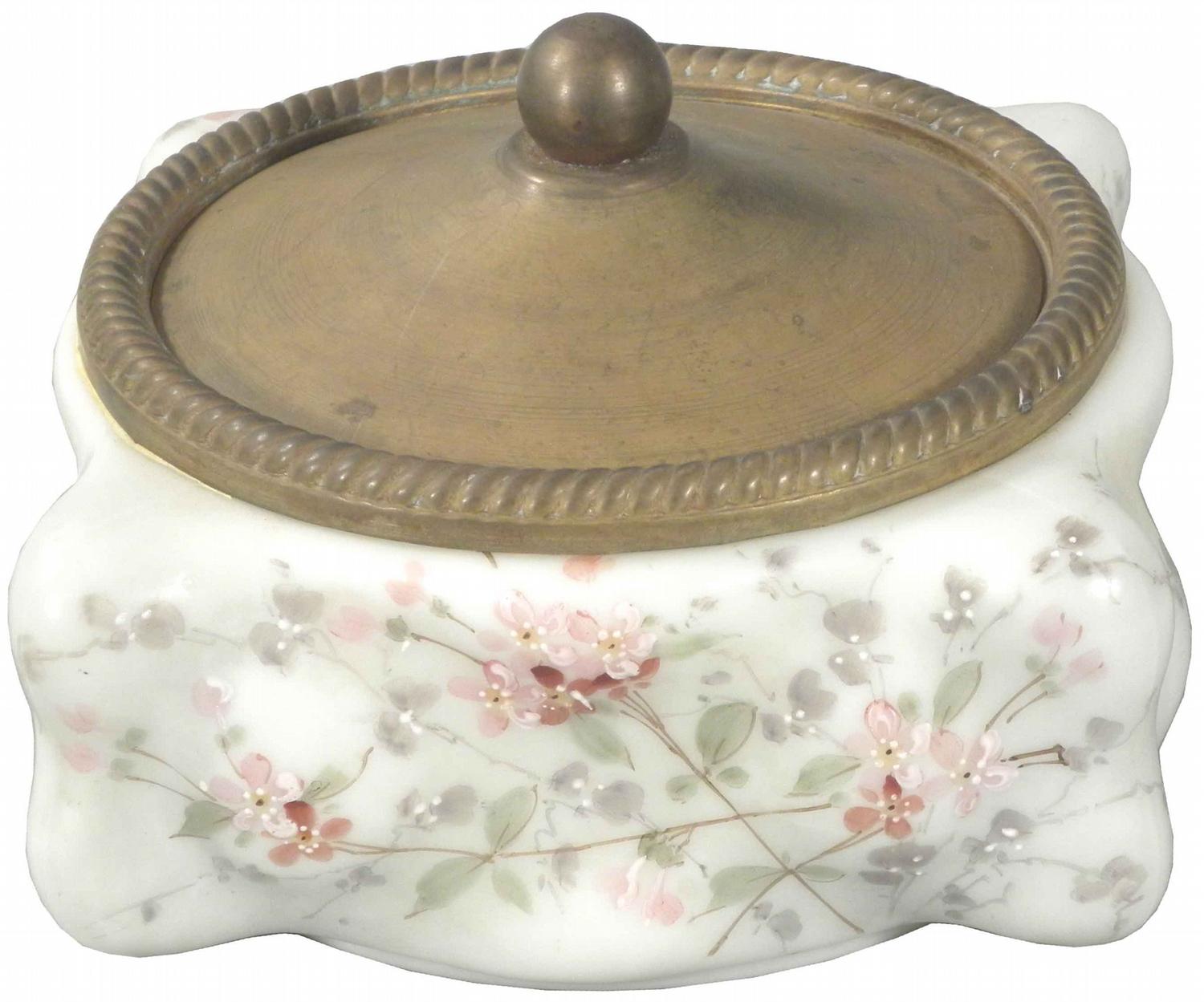 Wave Crest Lidded Bon Bon Jar. Blown out egg crate on white with pink floral motif. Brass lid and trim. Unmarked. 6 3/4 inches square X 5 1/2 inches tall.