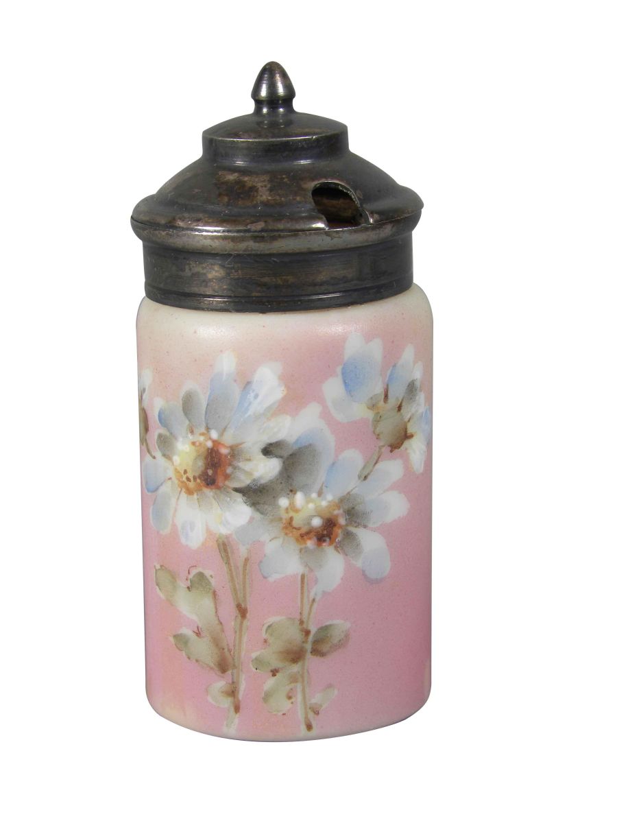 Wave Crest Lidded Mustard Jar, unmarked. Pink w/blue flowers. No chips or cracks, excellent condition. 1 1/2 X 3 1/2 X 1 1/2 inches.