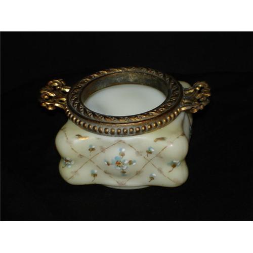 The Wavecrest Puff Pin Tray is an extrodinary piece made of opalware. The pin tray has an opague finish in a soft creamy ivory color with handpainted blue and white florettes with moss green leaves on front and back sides. The beaded rim is decorated with brass, and does not have a lining. I don't think a lining was ever made for tray. This beautiful piece was made by the C.F. Monroe Glass Company of Meriden Conn., at the turn of the century. The bottom is red stamped with Wavecrest Trademark and states, "WAVE CREST TRADE MARK, The C.F.M.Co.(c)and is an authentic Wave Crest Tin Tray. Tray stands 2-1/4"h x 3"d and is in excellent condition, considering piece is over 100 years old. Tiny chip on mouth of piece and normal wear signs noticeable. The Wavecrest Puff Pin Tray would be an excellent gift for that special someone! Please email with any questions. I will do my best in describing each item, however, I am not an expert in any field of antiques. This item is guaranteed to be genuine and authentic WaveCrest Puff Tin Tray. Payment Options are PayPal, Cashier Check, or Money Order. Item will be held 7-10 days for check clearance. Payment expectd within 7 days after auction ends. Seller is not responsible for loss or damage during shipping. Insurance is mandatory. Multiple auction wins will save on shipping costs. As always I stand behind what I sell.