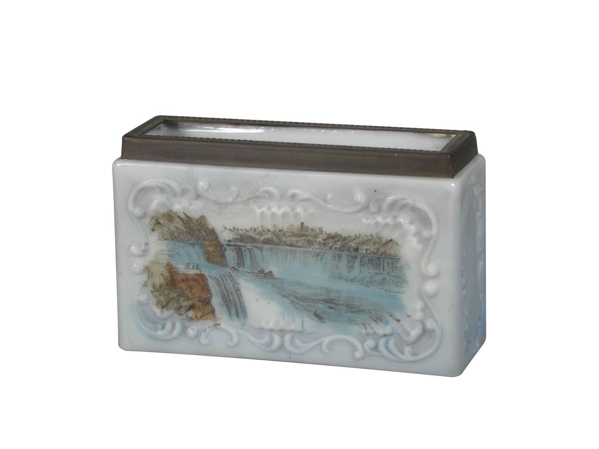 Wave Crest Photo/Letter Holder, unmarked. Waterfall scene, metal rim. No chips or cracks, excellent condition. 4 1/8 X 2 1/2 X 1 3/8 inches.